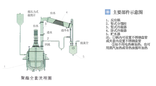 本全套裝置時用于生產不飽和聚酯樹脂、酚醛樹脂、環氧樹脂、ABS樹脂、油漆的關鍵設備。全套設備由反應鍋、豎式分餾柱、臥式冷凝器、貯水器、溢油槽、管線(對稀釜)等組成,全套設備與物料接觸部分采用不銹鋼制作。
